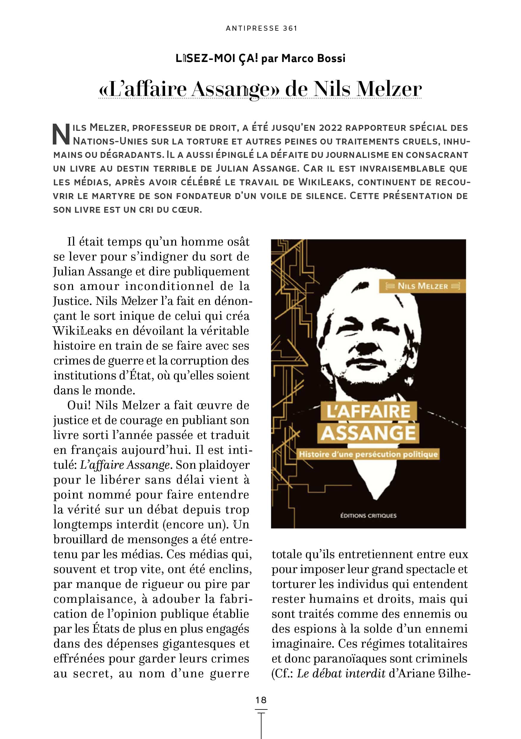 1 Nov 2022 À lire dans AntiPresse «L’affaire Assange» de Nils Melzer par Éditions Critiques | Classé dans : Articles, Presses et rencontres | 0
