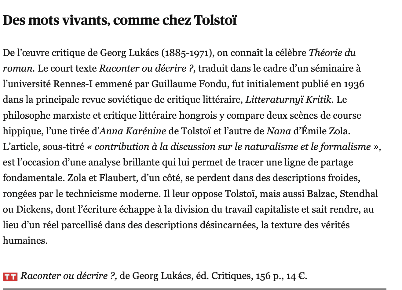 12 Juin 2021 Recension dans Télérama – Raconter ou décrire de G. Lukács par Éditions Critiques | Classé dans : Articles, Presses et rencontres | 0
